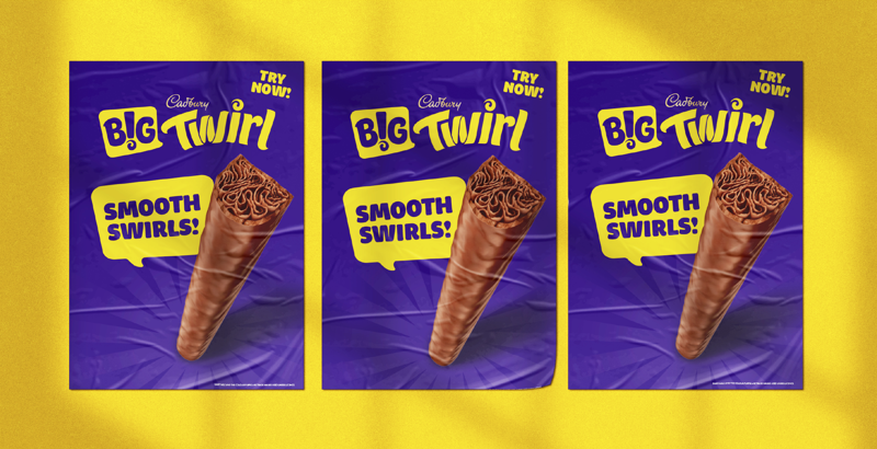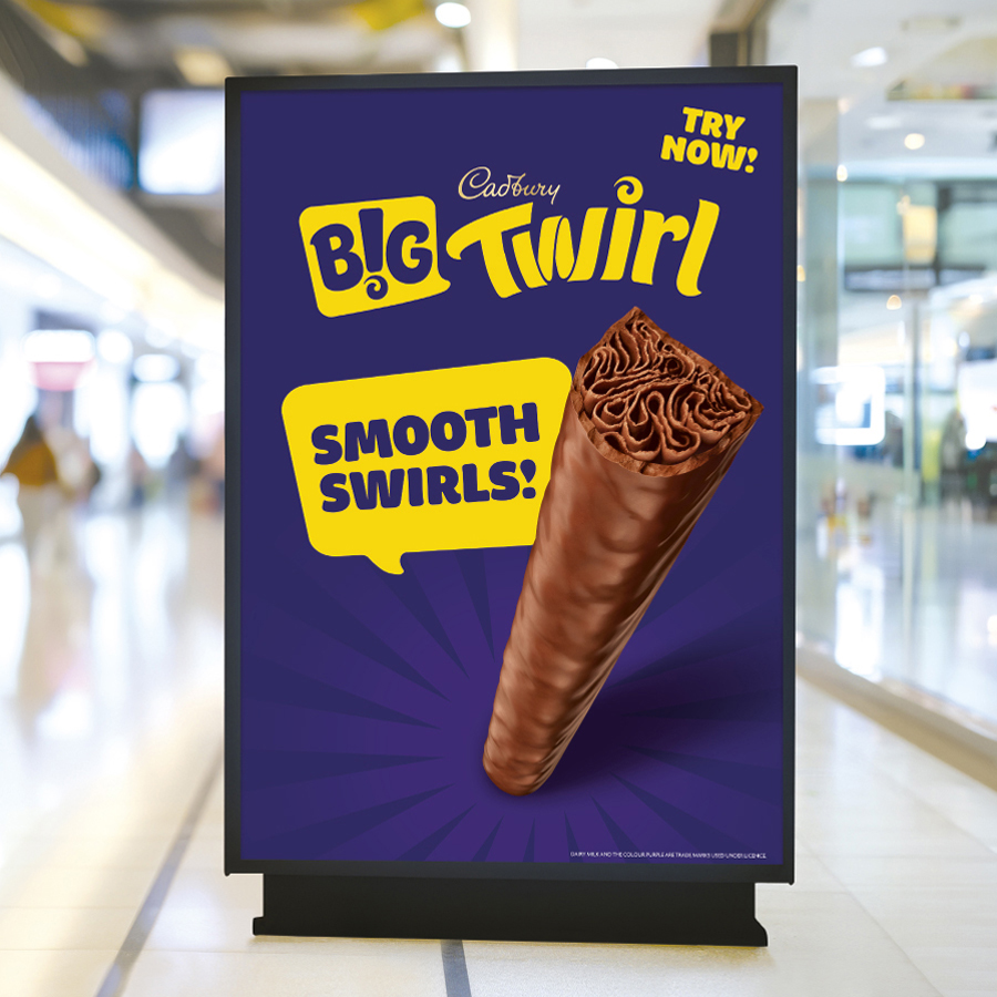 B! Brand leveraged the bold Twirl logo, dynamic chocolate swirls and Cadbury’s iconic purple to highlight the super-sized offering. The “BIG TWIRL” name amplified heritage. Larger-than-life Twirl imagery emphasised indulgence, while a disruptive speech bubble graphic device made the launch unmissable.