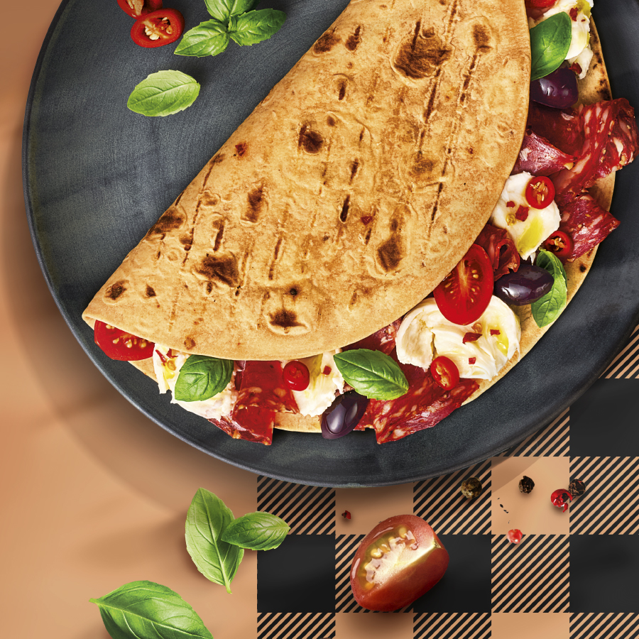 B! Brand created a distinctive, appetite-driven design for the Toscano Italian Flatbreads, using bold variant callouts, enticing photography and clear ‘heat, fill & fold’ instructions to enhance shelf standout, inspire use and maintain brand consistency.